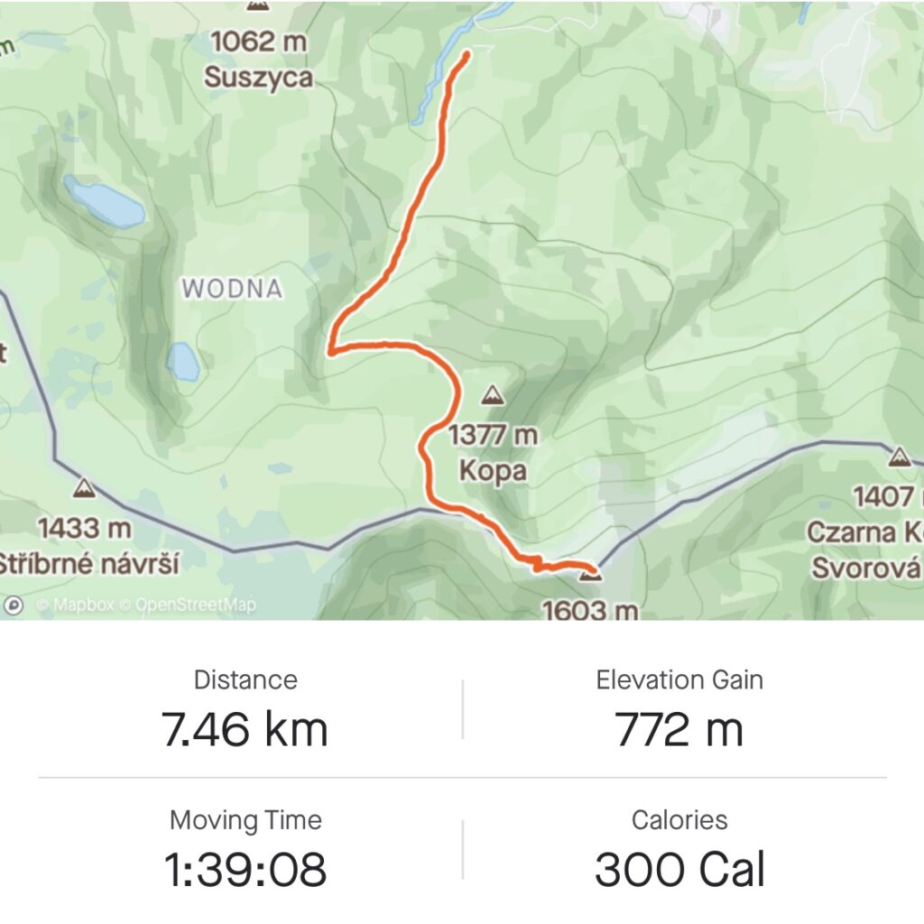 It was very unexpected to me that my lower-back froze and disabled me from walking fast during the initial inclination that lasted for 2km. I was struggling to make every step and had to stop from time to time in order to stretch my back what additionally was cooling my body down and making my lower-back even more stiff. I thought, it will be very hard way up filled with pain, if I will not warm up my body, but I was not able to accelerate and was condemned to struggle. I already accepted that next two hours will be very challenging and prepared myself mentally to experience a lot of pain.